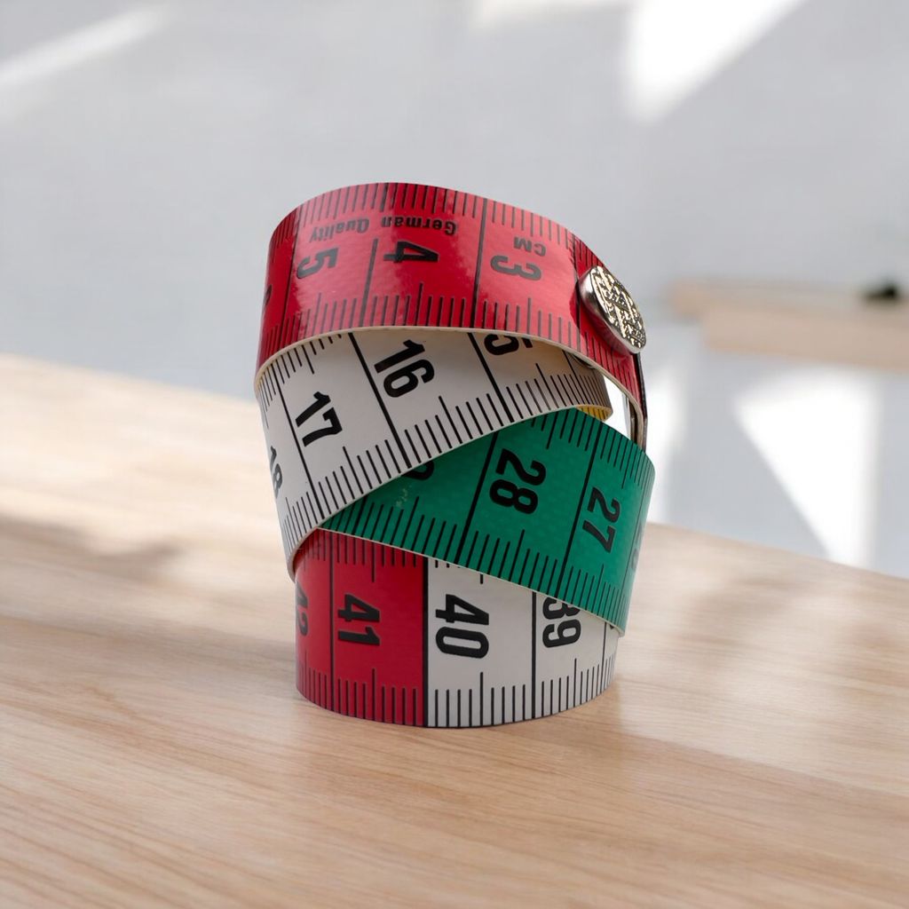 Et holdbart og pålideligt målebånd fra Metilde, med en længde på 150 cm og en praktisk trykknap til nem opbevaring. Den ene side af båndet viser mål i centimeter, og den anden i tommer, med tydelige farvemarkeringer for let aflæsning. Målebåndet er 0,5 mm tykt og har metalender på begge sider for at sikre langvarig brug.