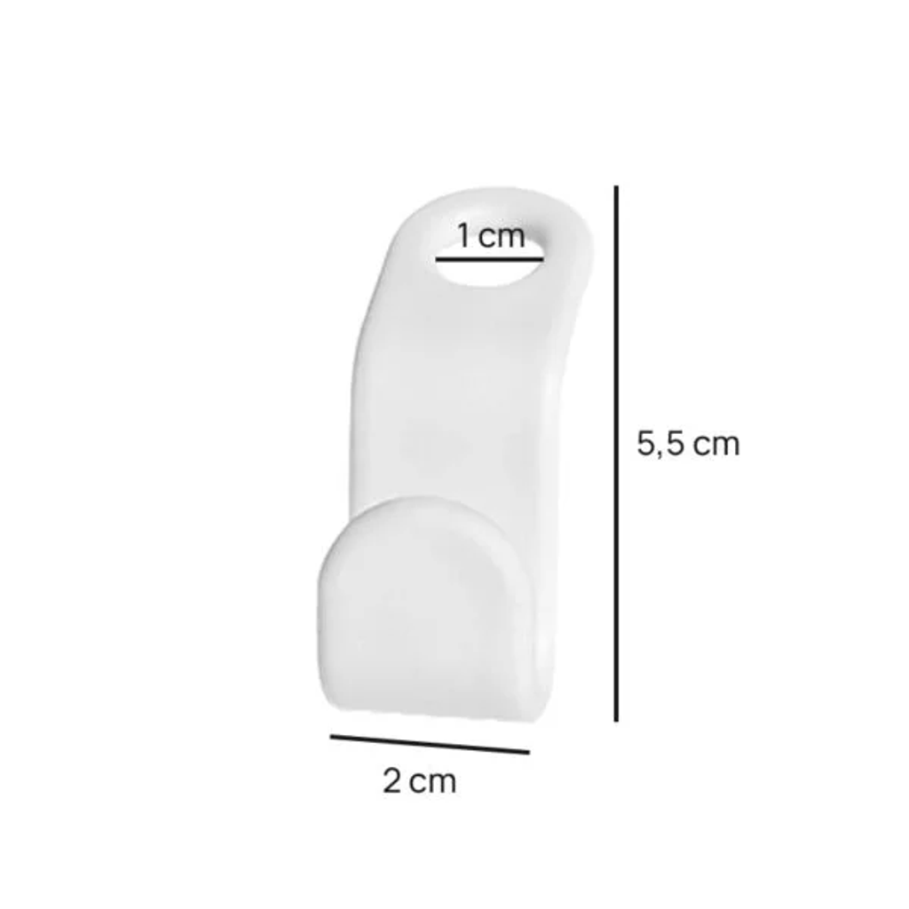 Tillverkade av hållbar plast, är dessa krokar både lätta och robusta. Varje krok har en kompakt storlek på 5,5 x 2 cm, vilket gör dem lätta att hantera och placera i garderoben. Hålets diameter på 1 cm passar perfekt för de flesta galgar, vilket gör installationen enkel och snabb. En effektiv lösning för att optimera garderobsutrymmet och hålla dina kläder och tillbehör välorganiserade.